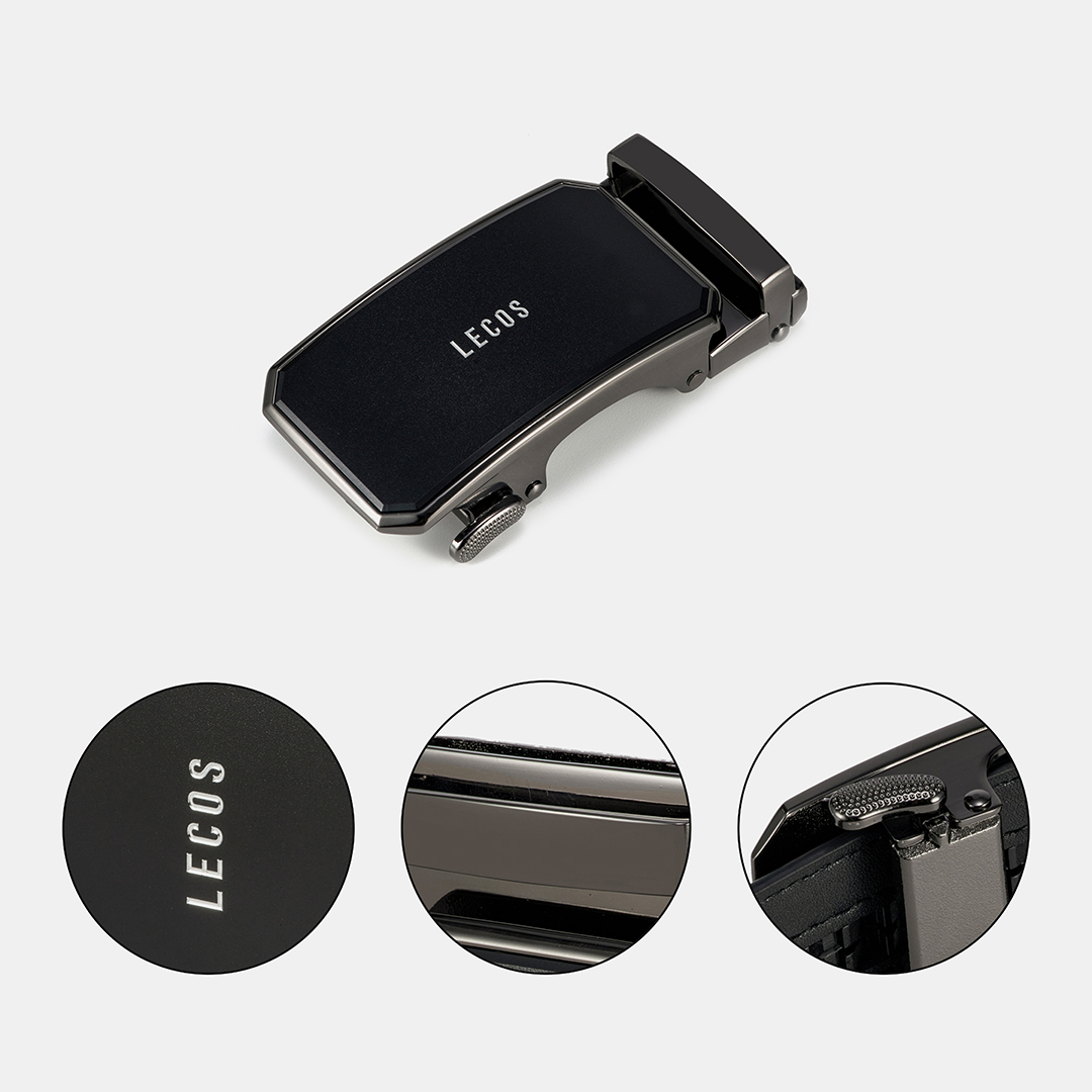 Chính giữa mặt khoá là logo LECOS được khắc nổi bằng công nghệ laser hiện đại, tạo điểm nhấn sắc sảo mà vẫn giữ tinh thần tối giản, sang trọngPhần chốt gài được gia công chắc chắn, thao tác linh hoạt, giúp cố định dây lưng gọn gàng, ổn định khi sử dụng