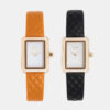 Mặt đồng hồ vuông vắn được bao bọc bởi lớp viền đính đá sáng bóng, tạo nên sự sang trọng và đầy tinh tế