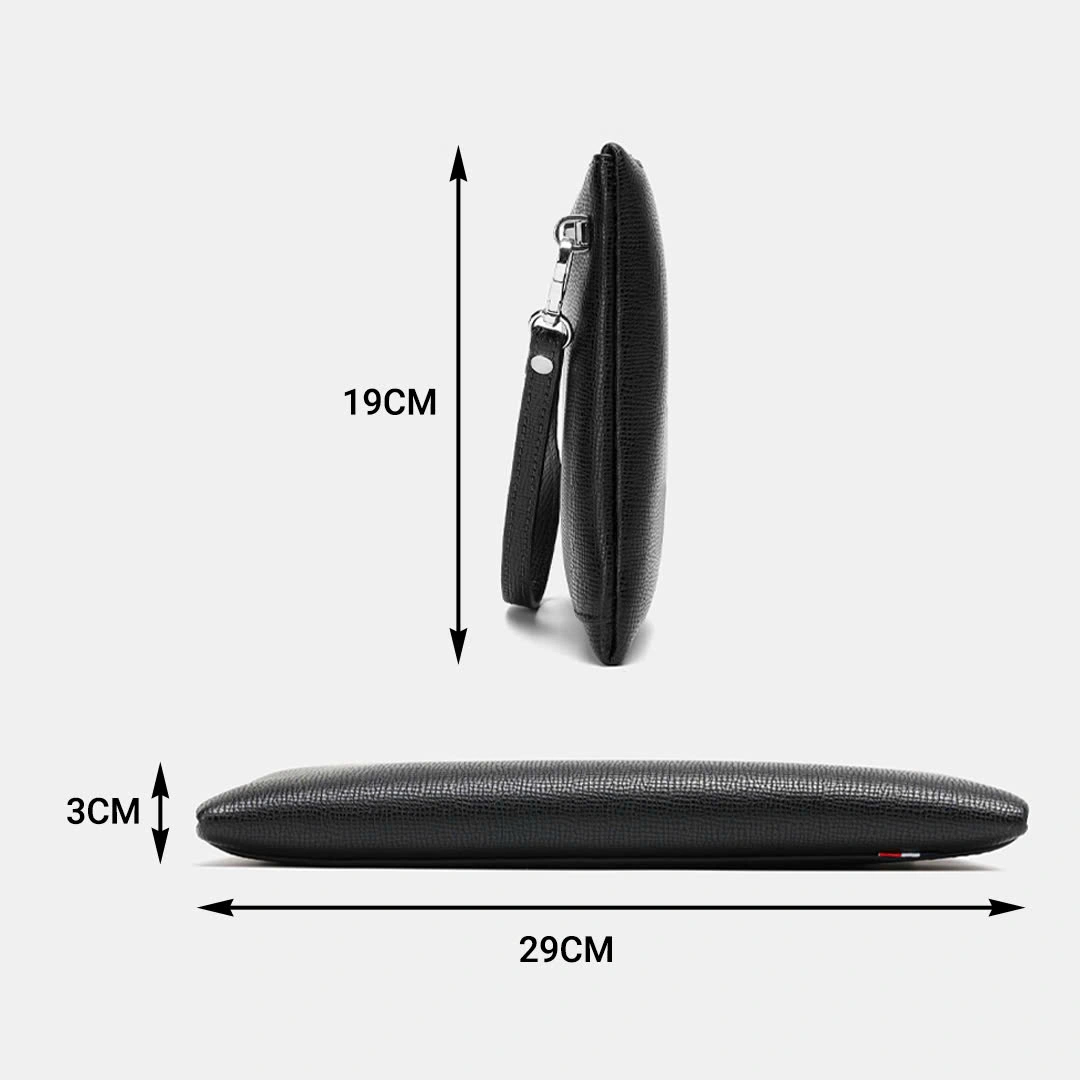 2 phiên bản màu thanh lịch: đen và nâuLưu ý: đối với kích thước, do có thể phương pháp đo lường khác nhau nên sẽ có sai số từ 1-3cmClutch với 1 ngăn chính lớn có khóa kéo, bên trong túi còn có thêm một ngăn mở nhỏ & một ngăn có khóa kéo, ngăn cài thẻ giúp quý ông dễ dàng sắp xếp đồ đạc ngăn nắp và tiện lợi