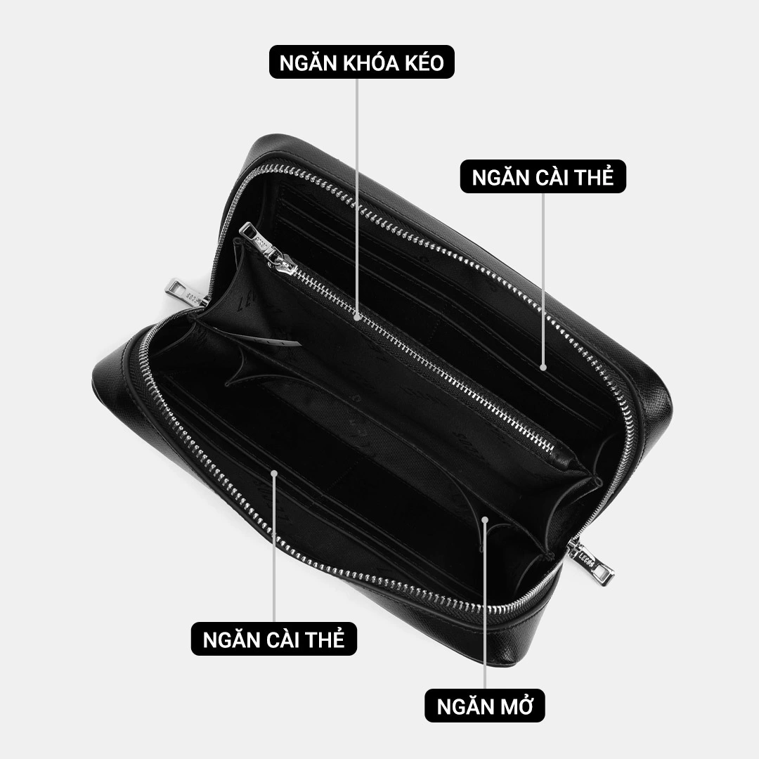 Lưu ý: đối với kích thước, do có thể phương pháp đo lường khác nhau nên sẽ có sai số từ 1-3cmClutch với 1 ngăn chính lớn, bên trong có ngăn có khóa kéo, ngăn mở và ngăn cài thẻ giúp quý ông dễ dàng sắp xếp đồ đạc ngăn nắp và tiện lợi