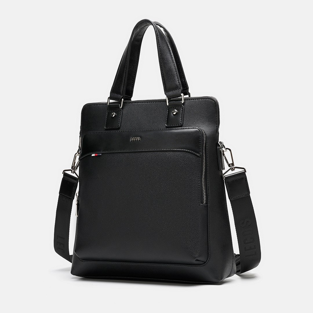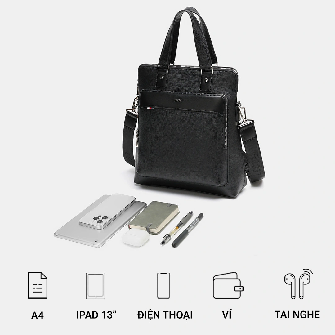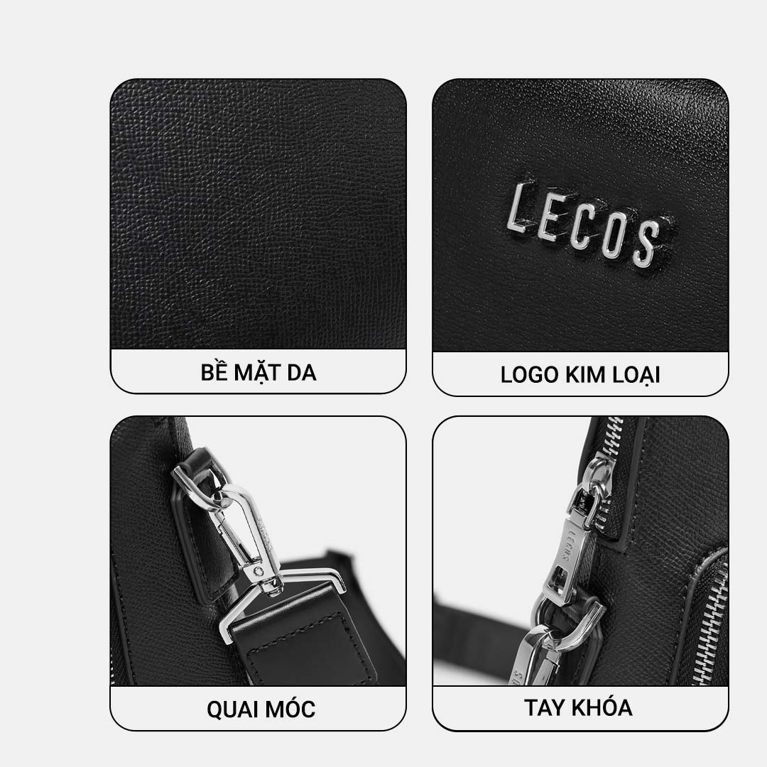 LECOS LT12 với thiết kế rộng rãi, có nhiều ngăn, có thể đựng ipad, điện thoại và nhiều đồ dùng cá nhân khácLogo LECOS được khắc trên móc cài, khoá kéo bằng kim loại màu bạc sang trọng tạo nên một tổng thể đẹp hoàn hảo và ấn tượng