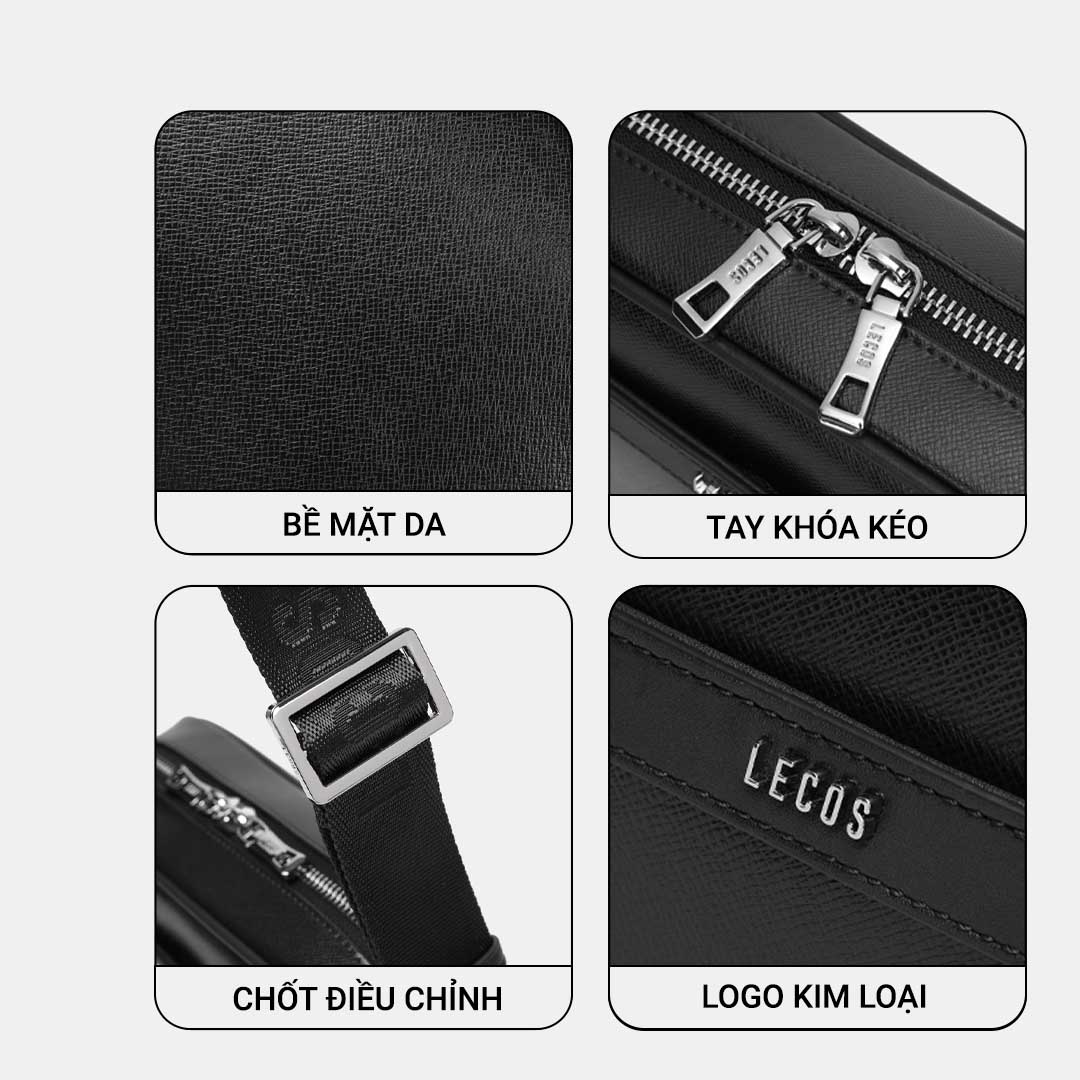 LECOS LT16 với thiết kế tương đối rộng rãi, có nhiều ngăn, có thể đựng điện thoại và nhiều đồ dùng cá nhân khácLogo LECOS màu bạc sang trọng được gắn mặt trước thân túi; được khắc trên móc cài, khoá kéo bằng kim loại màu bạc sang trọng nổi bật thương hiệu và khẳng định chất lượng sản phẩm cao cấp chính hãngLECOS LT16 được chế tác từ da bò thật cao cấp mềm mịn, bền đẹpThiết kế mặt trước túi có một ngăn phụ mở có thể để vật nhỏ như điện thoại, bút viết…rất tiện dụng
