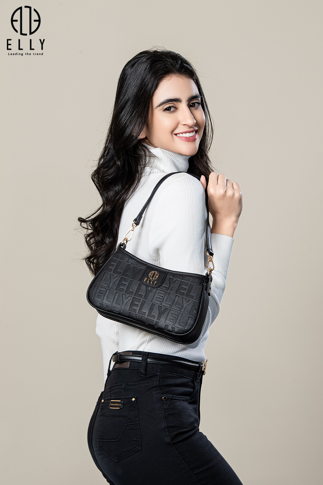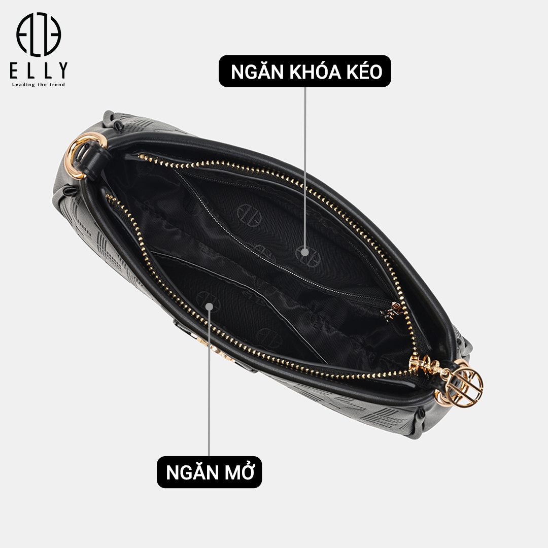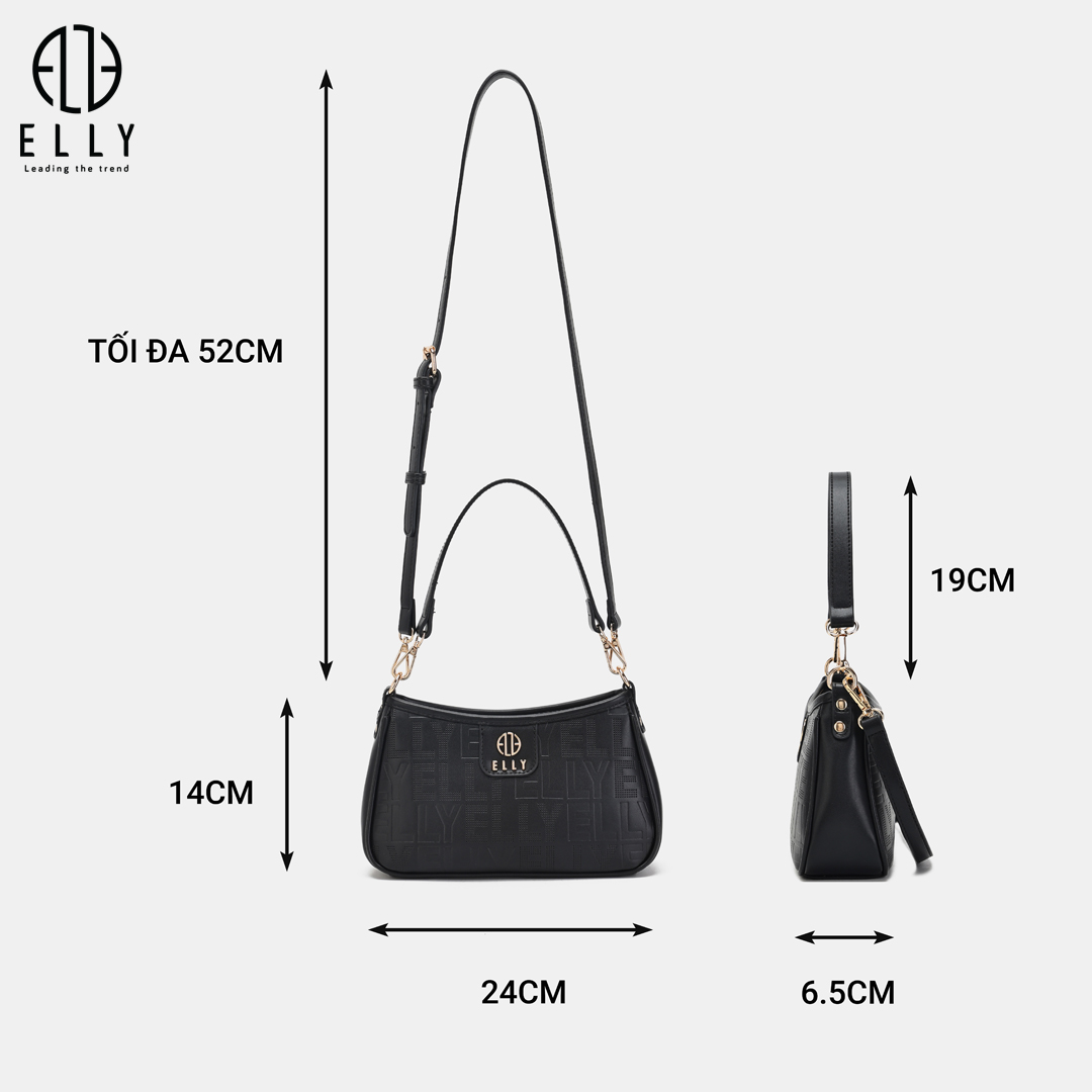 Logo ELLY được dập nổi tinh xảo trên bề mặt túi, tạo điểm nhấn và thể hiện đẳng cấp thương hiệuLogo ELLY vàng đồng nổi bật được gắn trước túi, tạo điểm nhấn cho phong cách và khẳng định thương hiệu