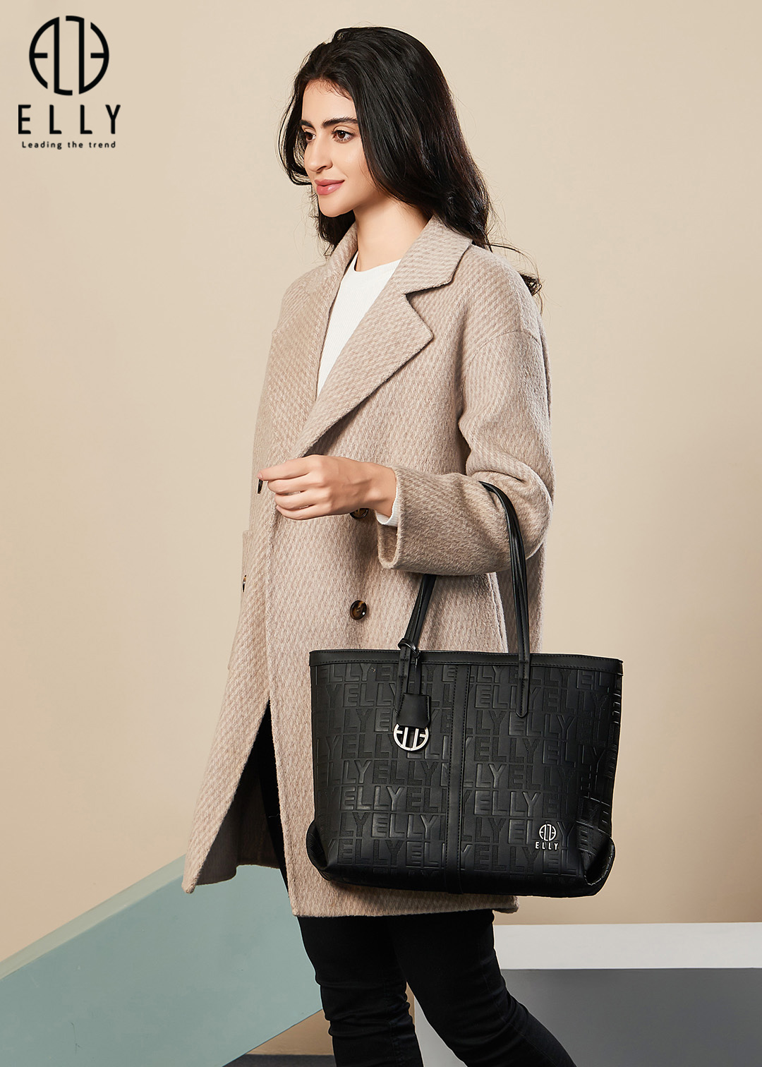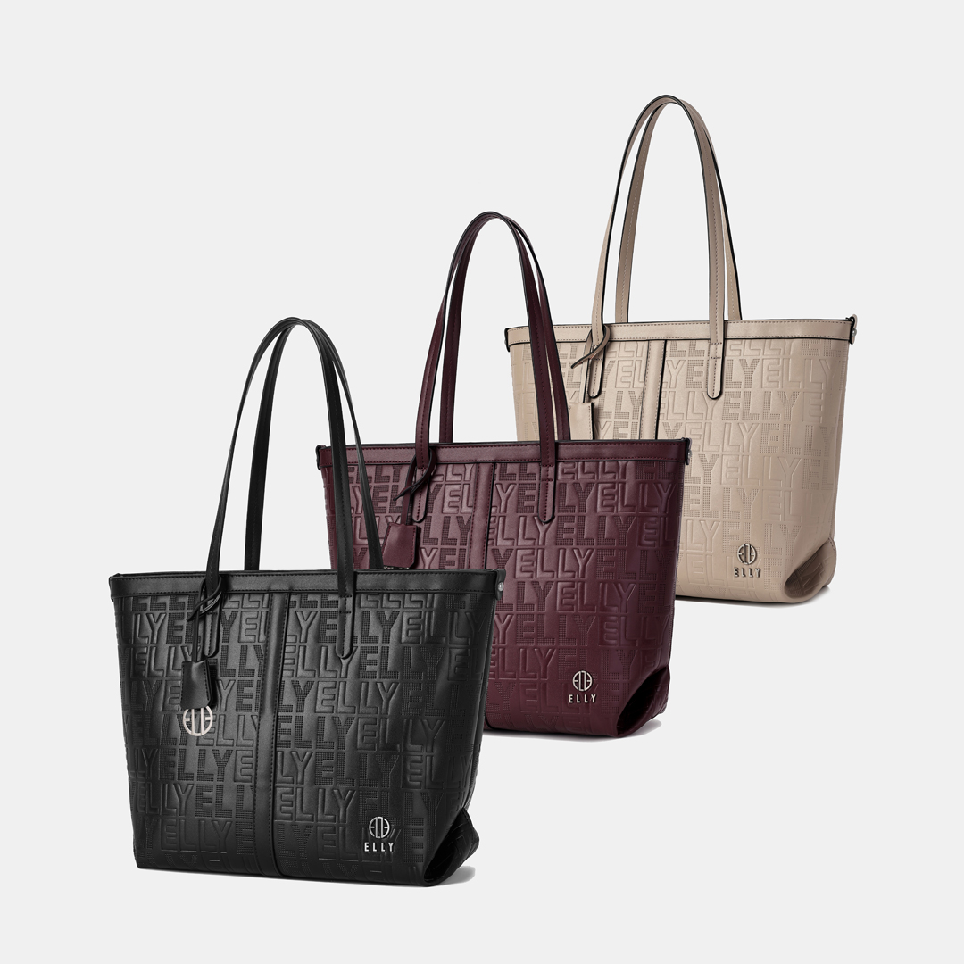 Họa tiết chữ ELLY dập nổi trên toàn bộ bề mặt túi tạo nên vẻ đẹp độc đáo và thu hútLogo thương hiệu sang trọng tạo điểm nhấn tinh tế