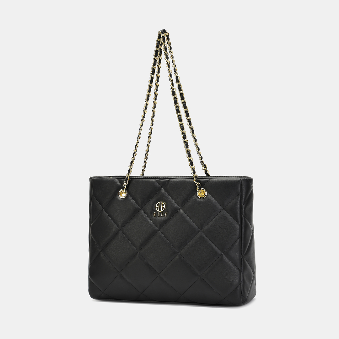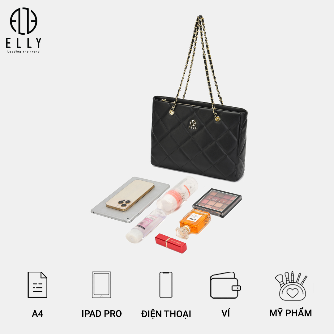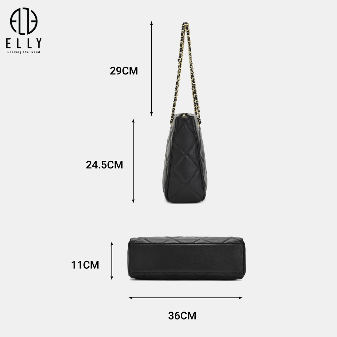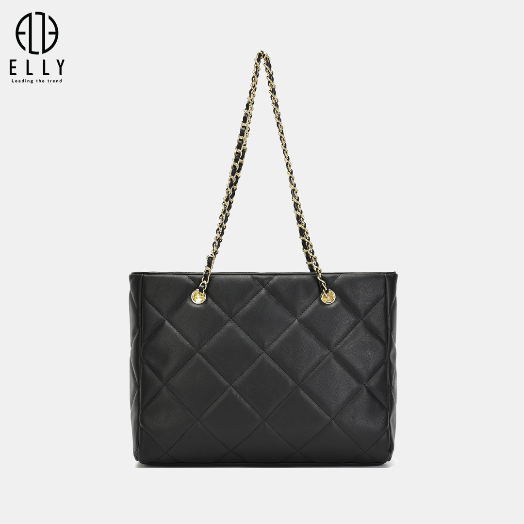 EL361 sở hữu thiết kế thanh lịch với form túi tote hiện đại, nổi bật bởi bề mặt chần chỉ ô trám bản lớn đầy sang trọng. Logo ELLY kim loại được đặt tinh tế ở mặt trước, tạo điểm nhấn đẳng cấp và thu hút. Dây đeo xích phối kim loại ánh vàng mang đến vẻ ngoài thời thượng, giúp tổng thể thêm phần nổi bật. Với không gian rộng rãi và kiểu dáng dễ phối đồ, EL361 phù hợp cho cả đi làm, dạo phố hay gặp gỡ đối tác.
