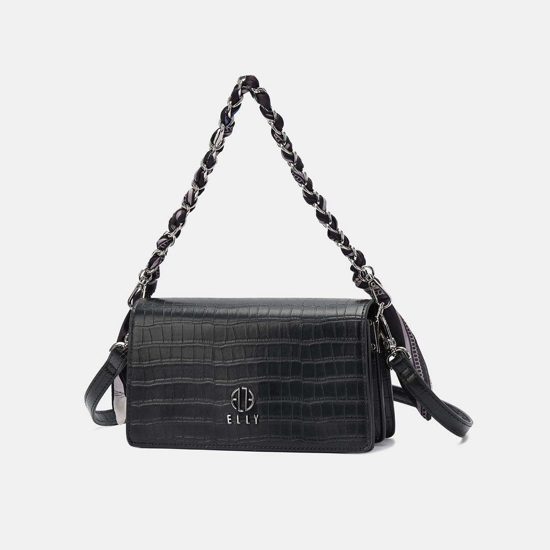 Túi có tông đen sang trọng, bề mặt được xử lý tinh tế với họa tiết vân da cá sấu giả cao cấp, tạo cảm giác hiện đại và đẳng cấp.