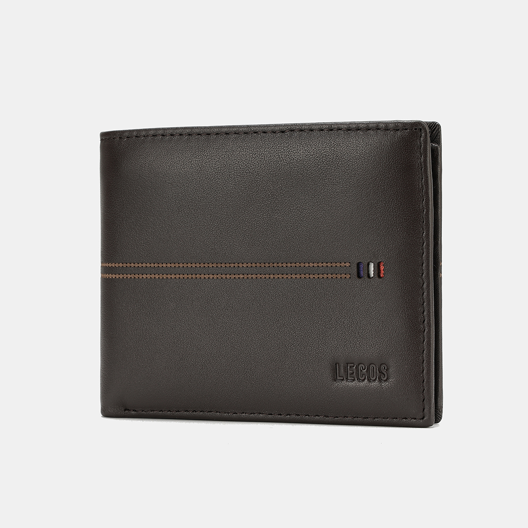 Tên thương hiệu LECOS được dập mặt trước ví sang trọng nổi bật nhằm khẳng định chất lượng sản phẩm cao cấp chính hãng